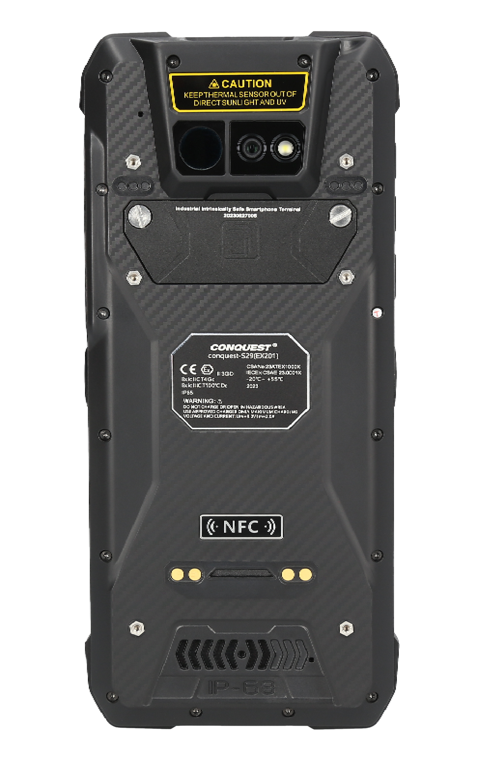 Empower your frontline experience with Conquest EX201, a rugged device featuring customizable options such as thermal imaging camera, barcode scanner, satellite communication, high-powered flashlight, DMR functionality, and temperature sensor. No two operations are alike, ensuring that your device is uniquely suited to your specific needs.