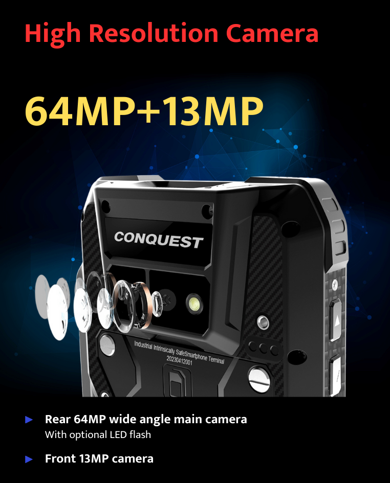 Built for Demanding Industries Customized for the rigorous demands of the oil and gas industry, chemical and pharmaceutical manufacturing, aviation, logistics, transportation, warehousing, energy, and mining, the Conquest EX201 undergoes rigorous testing for ruggedness and durability. Engineered to excel in challenging environments, it stands resilient against the toughest conditions. In critical sectors like these, where durability is paramount, the Conquest EX201 ensures unwavering performance, meeting the demands of repeated use and providing reliability you can trust.